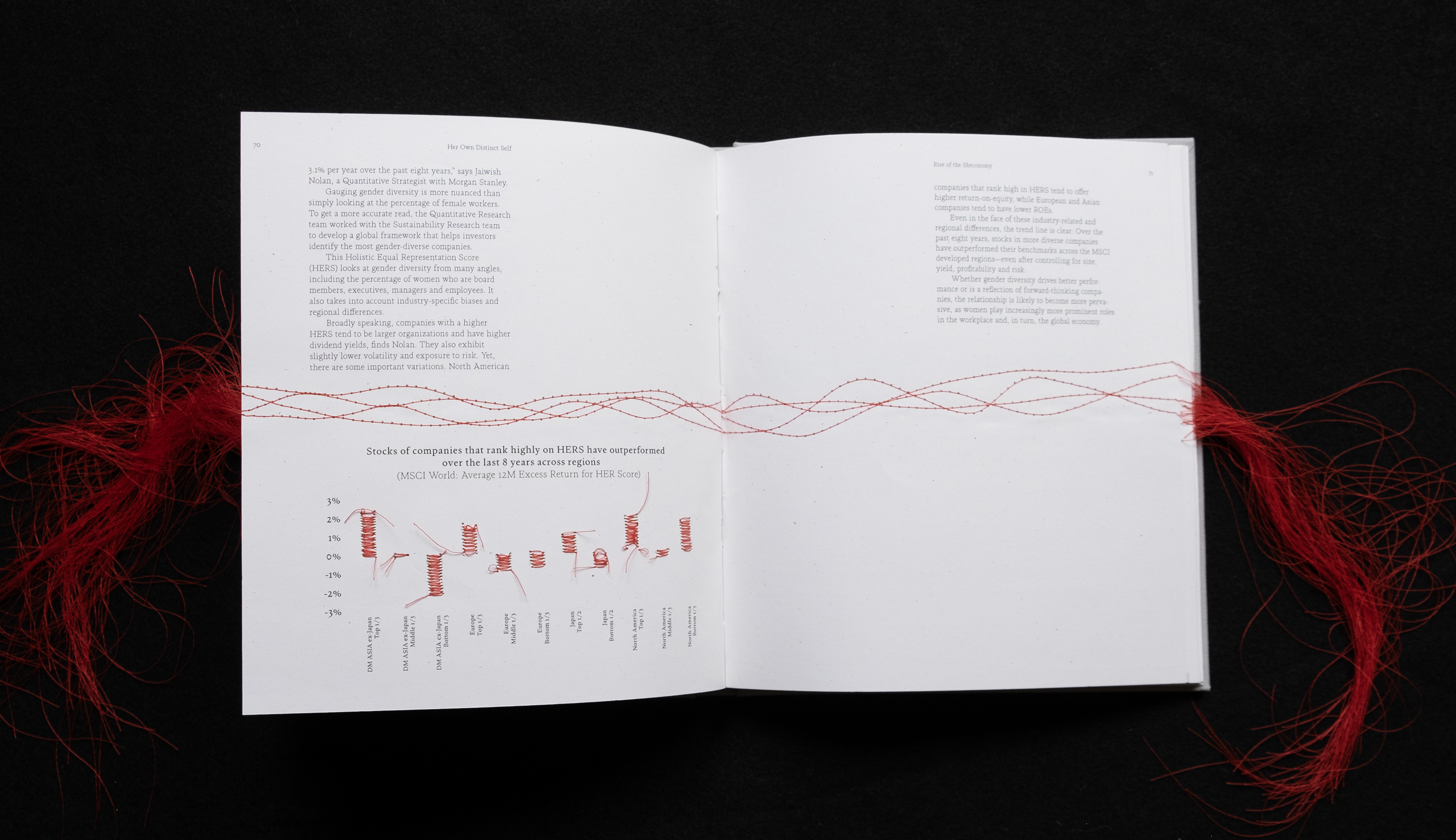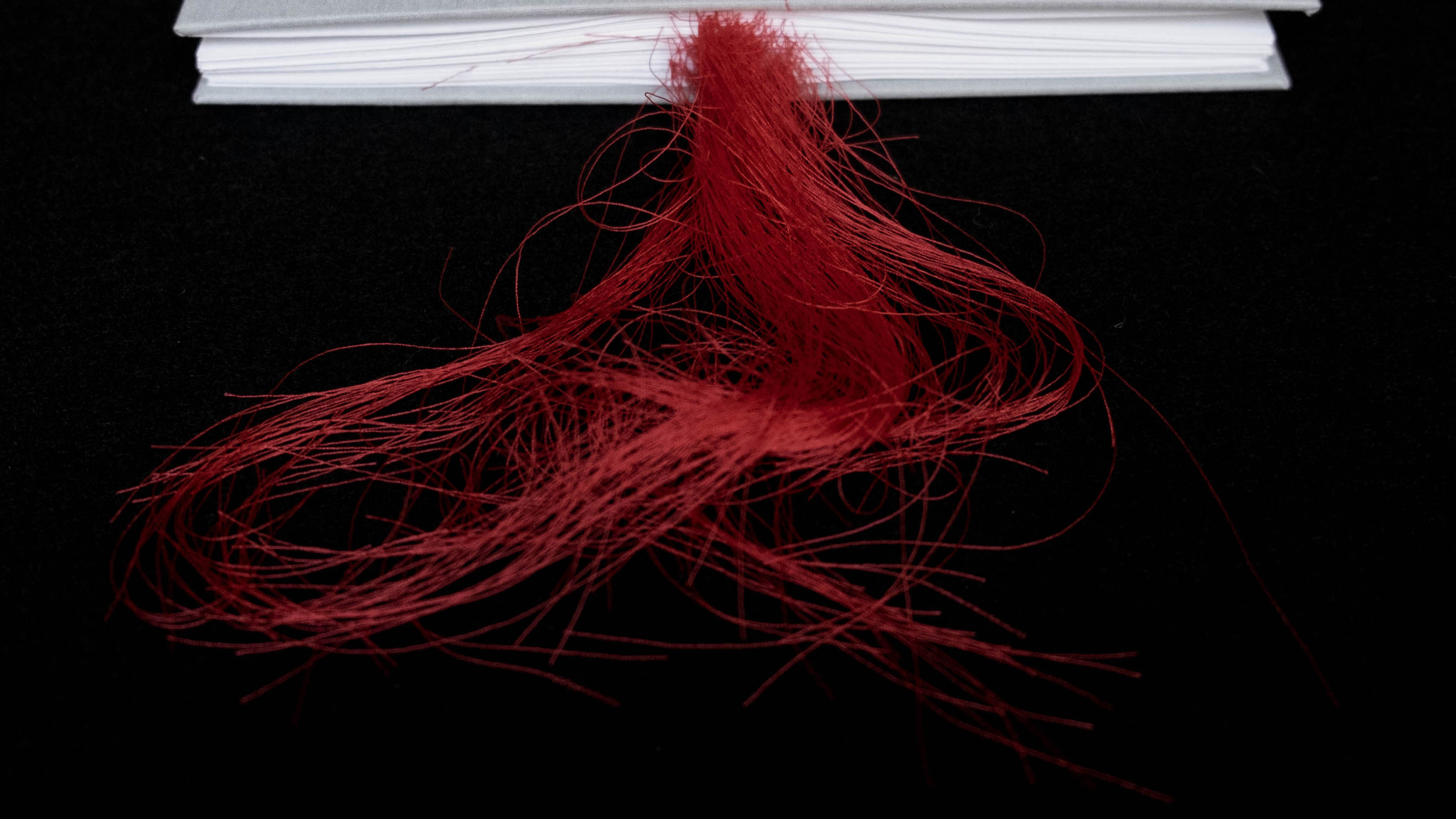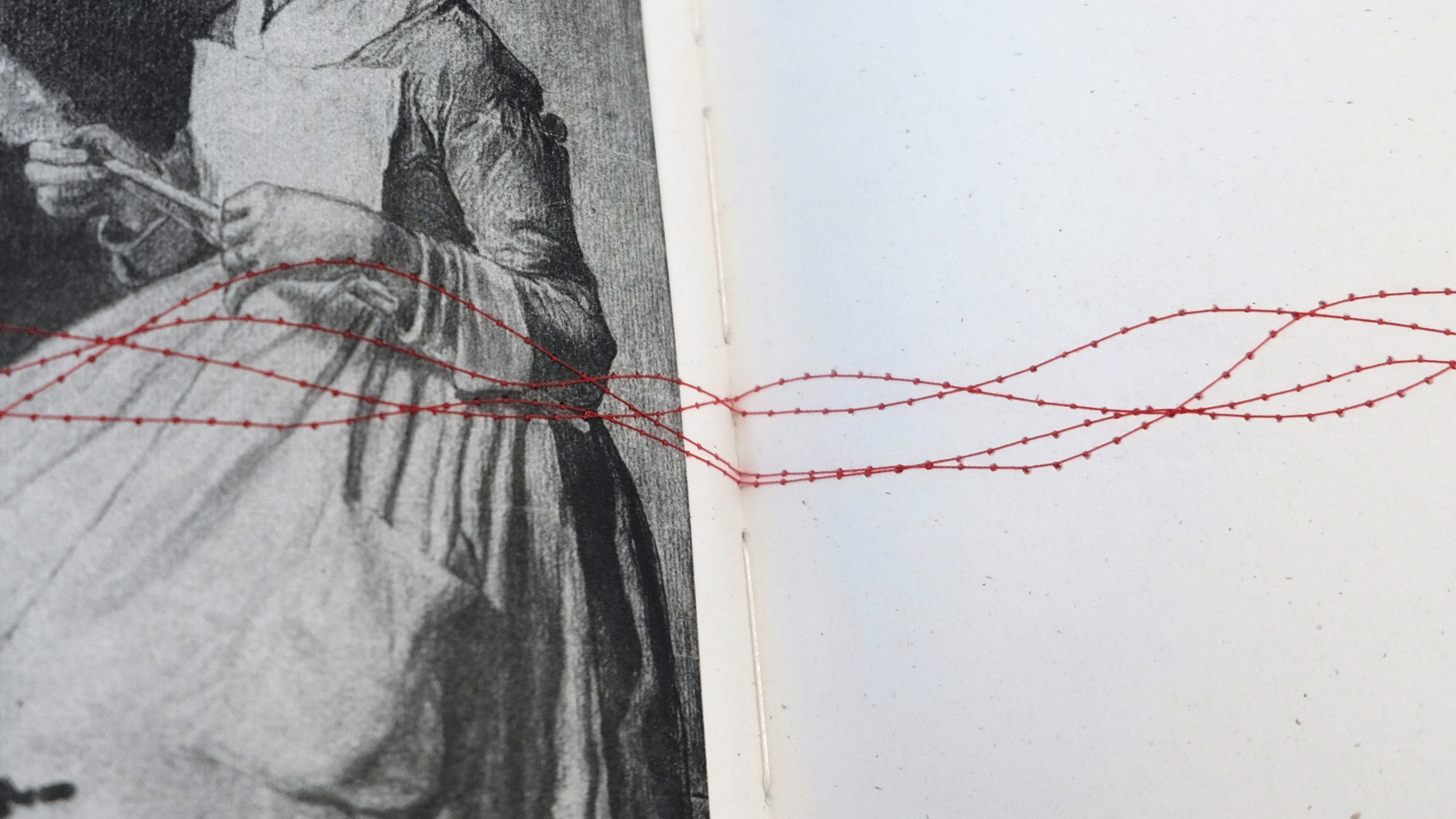 Each sheet of paper was stitched on a sewing machine with a growing then decreasing number of stitches per page to reflect the emotions invoked by each chapter.